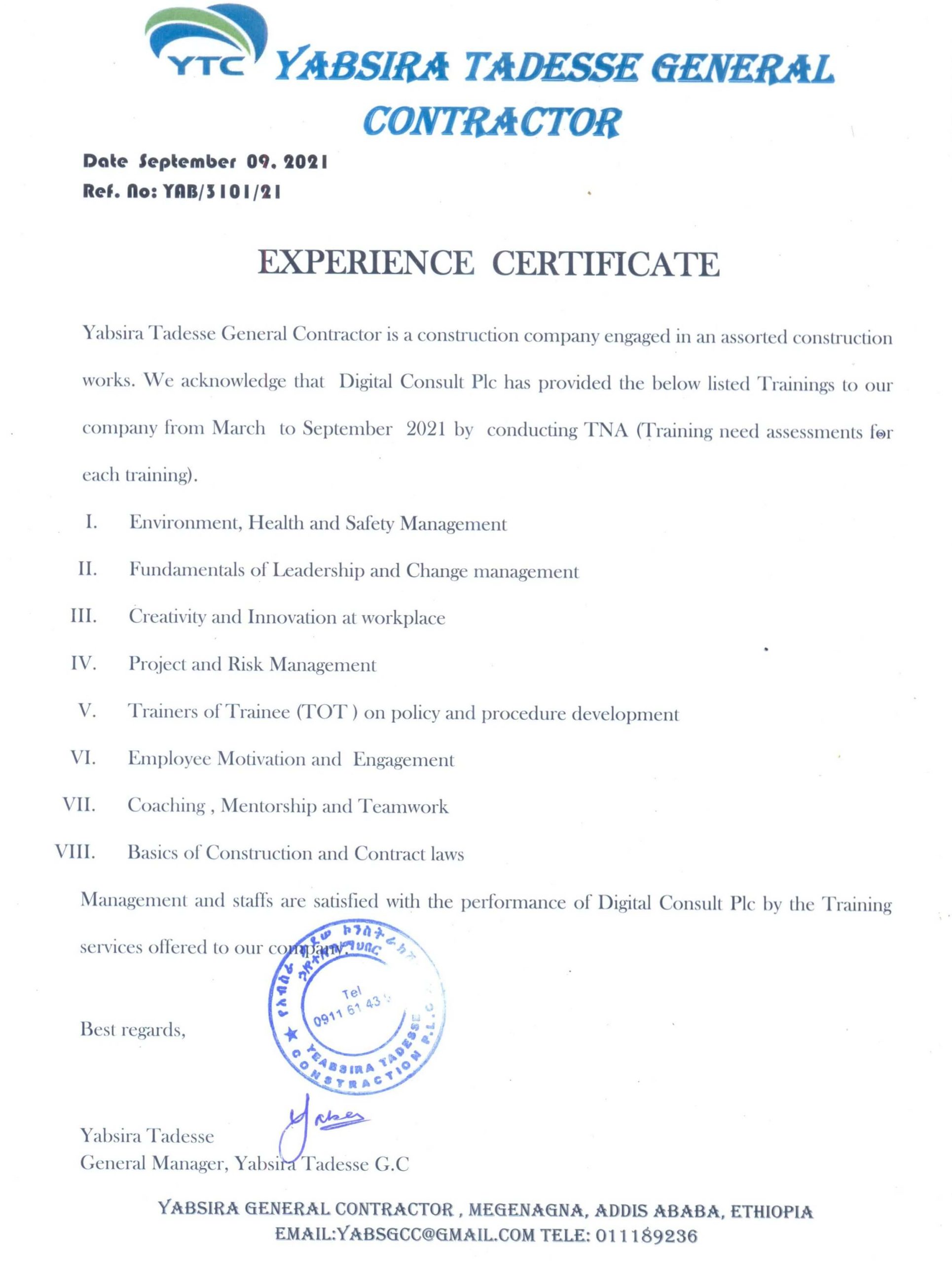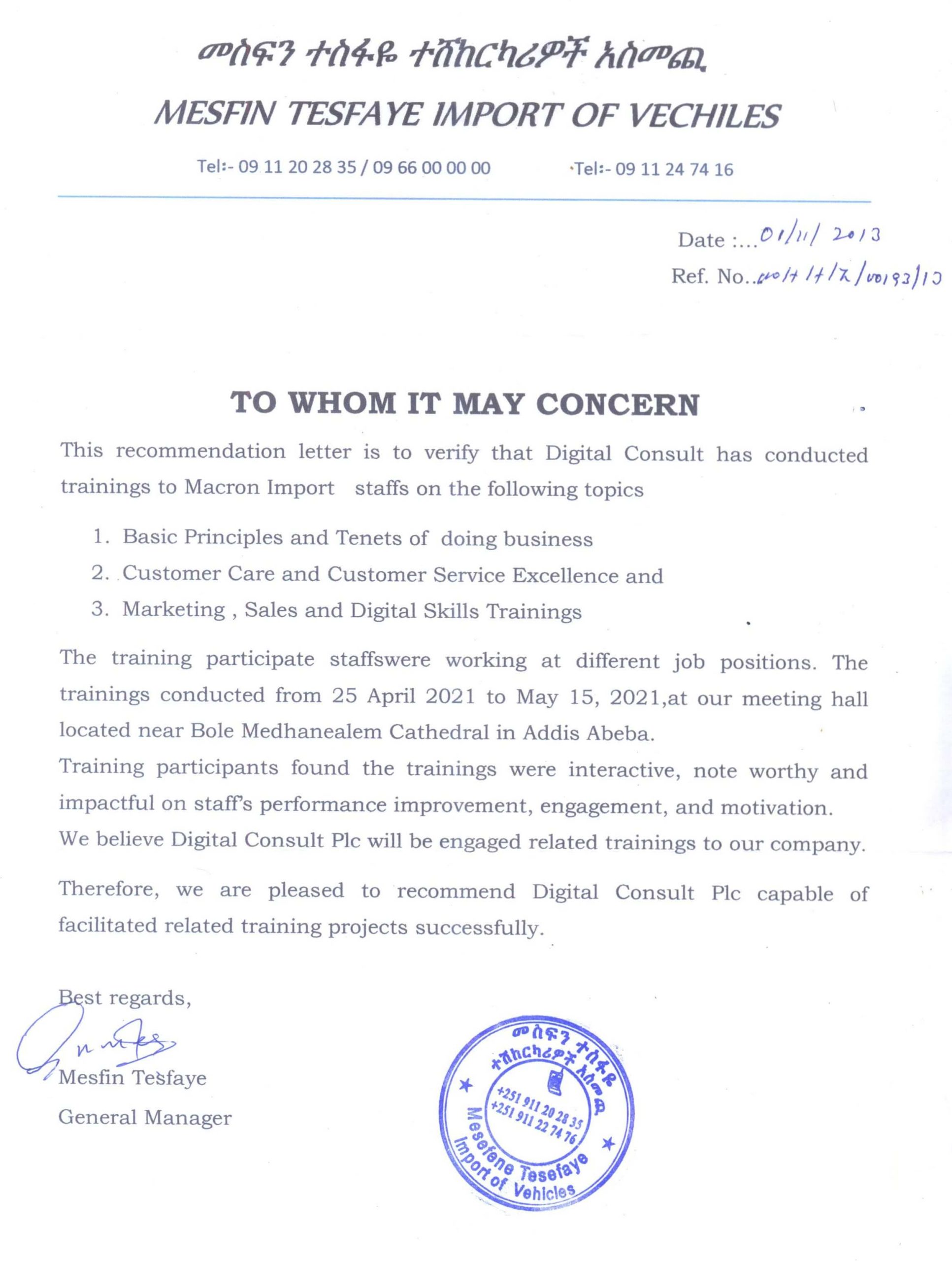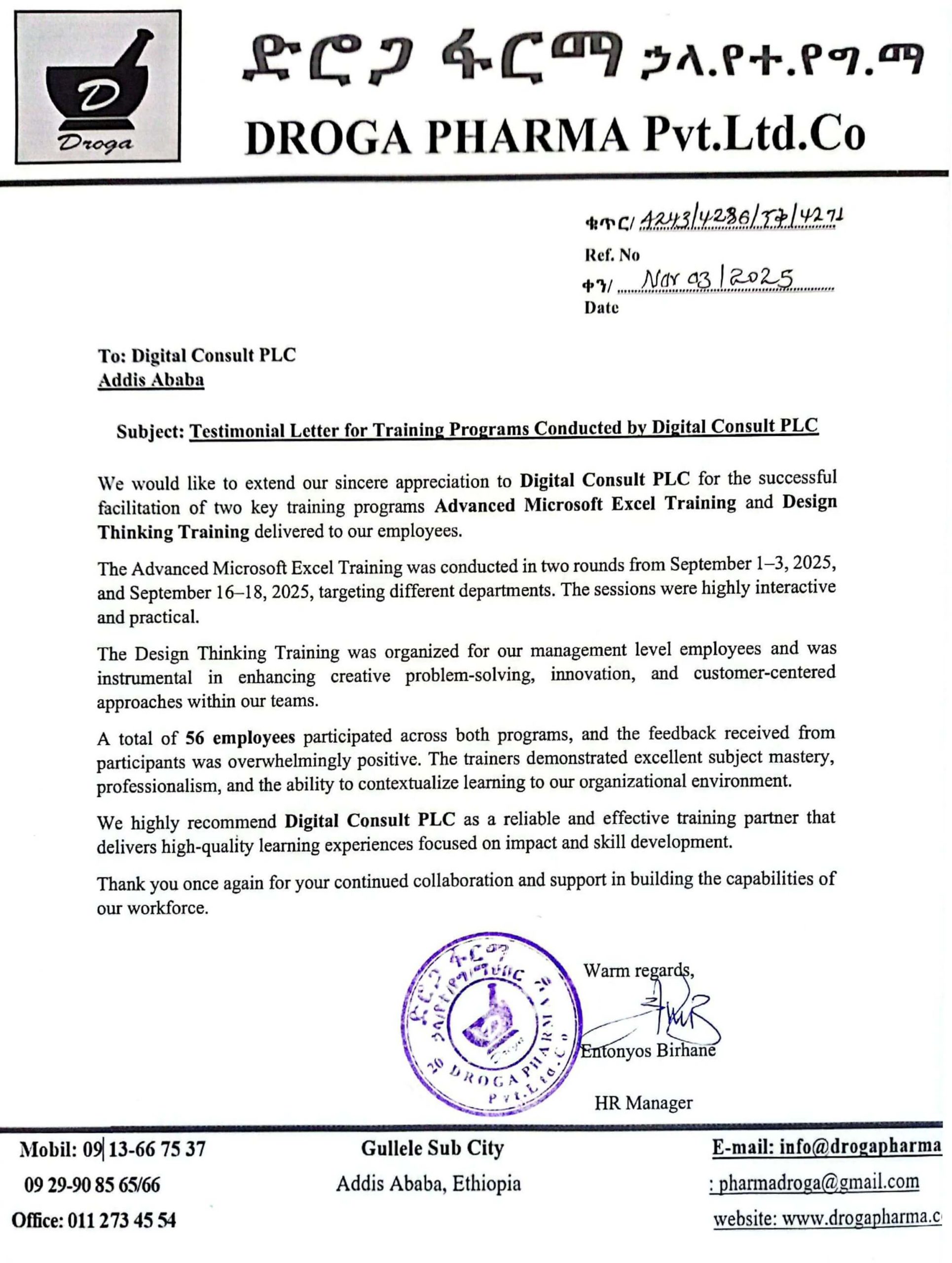 Yes, Our Company provides training and Consultancy services in Addis Ababa and all regions across Ethiopia.